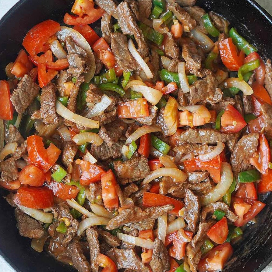 RANCH-STYLE STEAK, TENDER BEEF COOKED WITH SLICES OF ONION AND TOMATO WITH A TOUCH OF SERANO PEPPER.